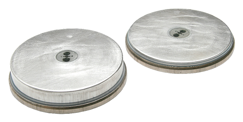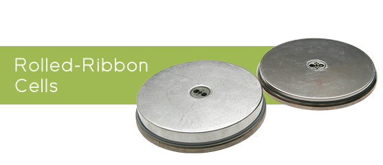 Rolled-Ribbon cells are constructed by interleaving and winding long, narrow strips (ribbons) of anode, cathode, and separator materials onto a hub, producing an electrode roll (hence the term, “Rolled-Ribbon”). Winding electrodes is one of the oldest, lowest-cost, and most reliable methods for producing cells. The electrode roll is compressed between two pans that are separated by an insulated sealing ring, and the cell assembly is crimp-sealed. One pan serves as the cell’s anode terminal, and the other serves as its cathode terminal. The electrode ribbons in the electrode roll are perpendicular to the large, flat surfaces of the pans. The entire edge of the anode ribbon is in direct contact with the anode pan, and the entire edge of the cathode ribbon is in direct contact with the cathode pan. There are no welded tabs of any kind. These unique features are illustrated in the diagram below.